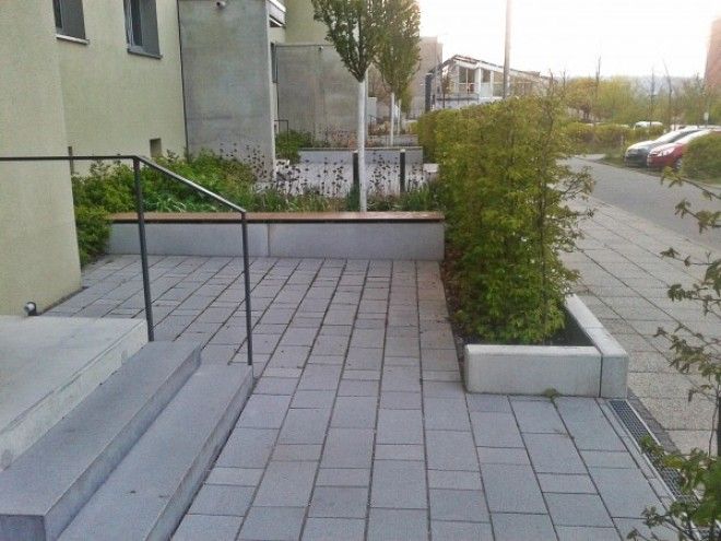 Подход к дому защищен от дороги невысокой бетонной оградой, за которой насадили зеленые кустики, разбавляющие избыток серого цвета.