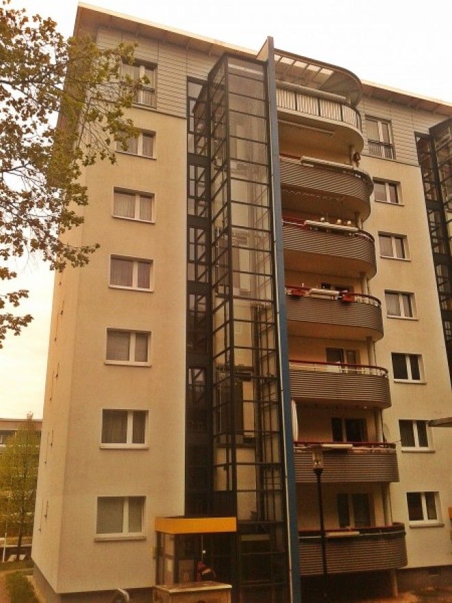 Еще один панельный дом, отремонтированный уже давно и совсем в другом стиле. Он интересен тем, что к нему пристроили лифты, которых не было в изначальном проекте дома. Это довольно распространенная практика в Германии.