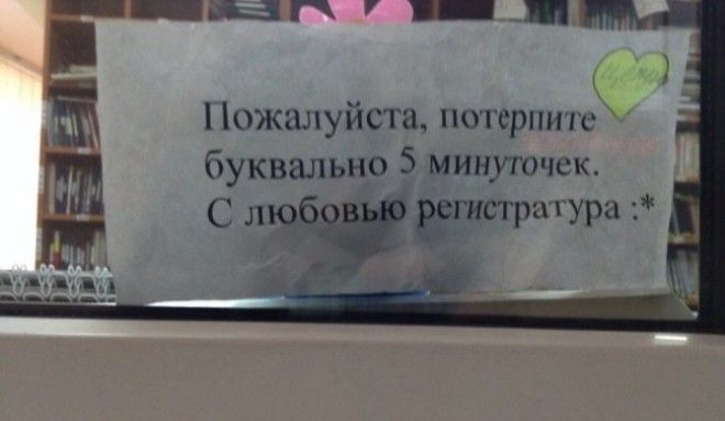 Пока стоишь в очереди, можно поднять себе настроение, читая таблички и плакаты!