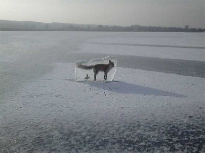 Смотритель озера нашёл лисицу, замёрзшую во льду, вырезал её и поставил как знак, чтобы люди не ходили по льду